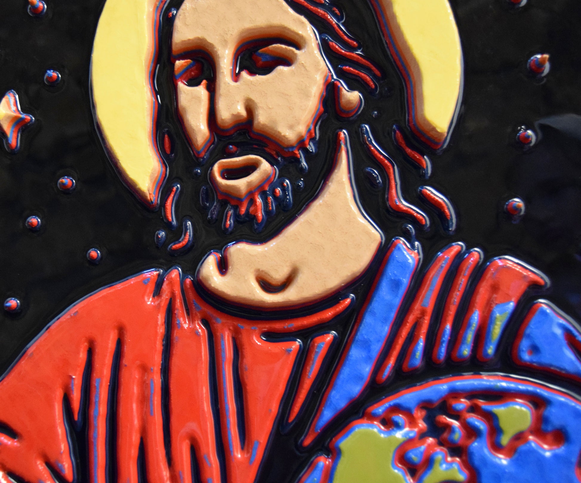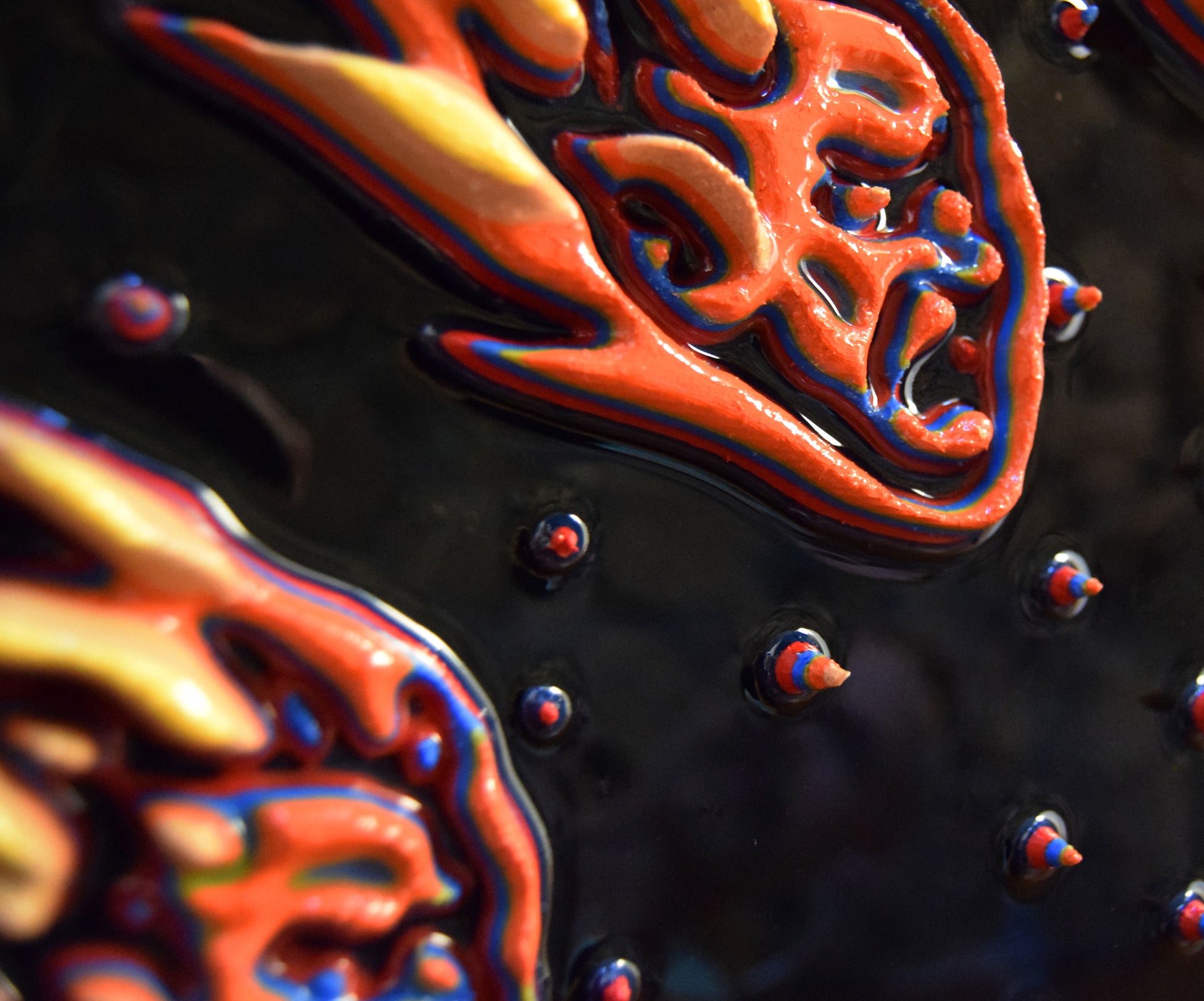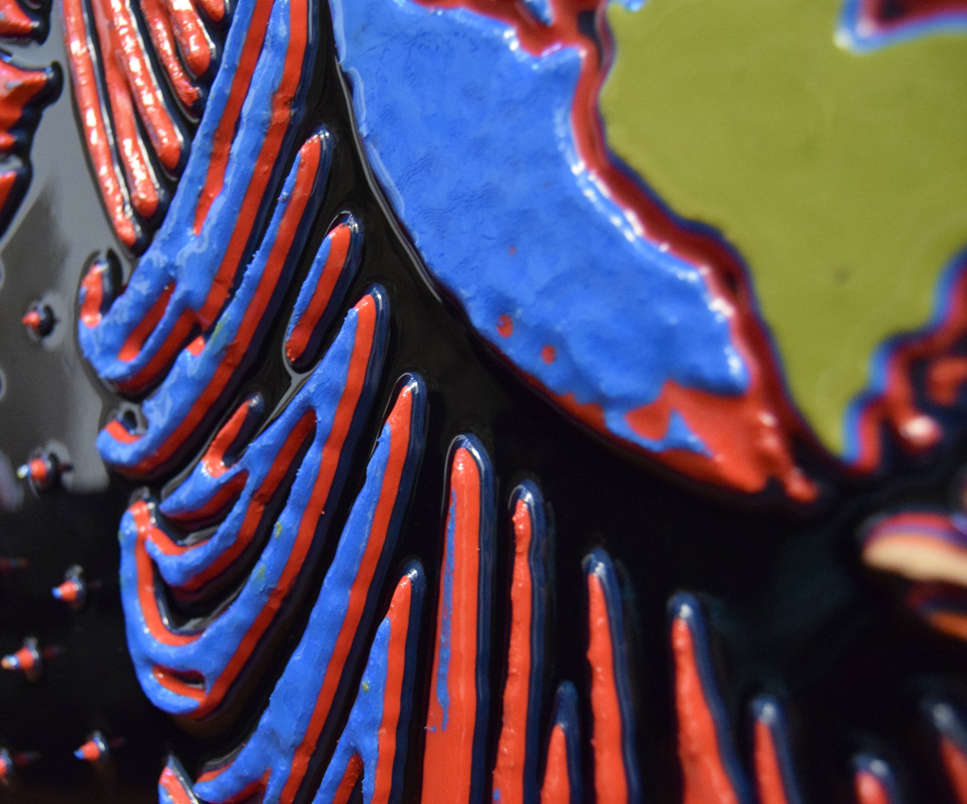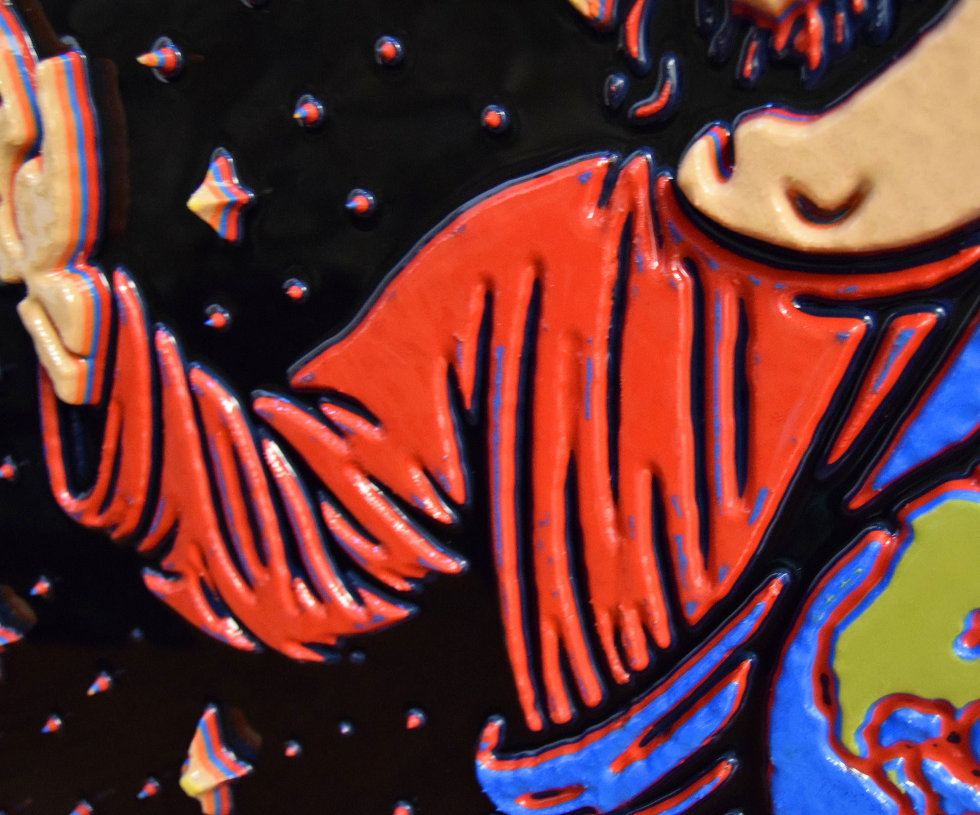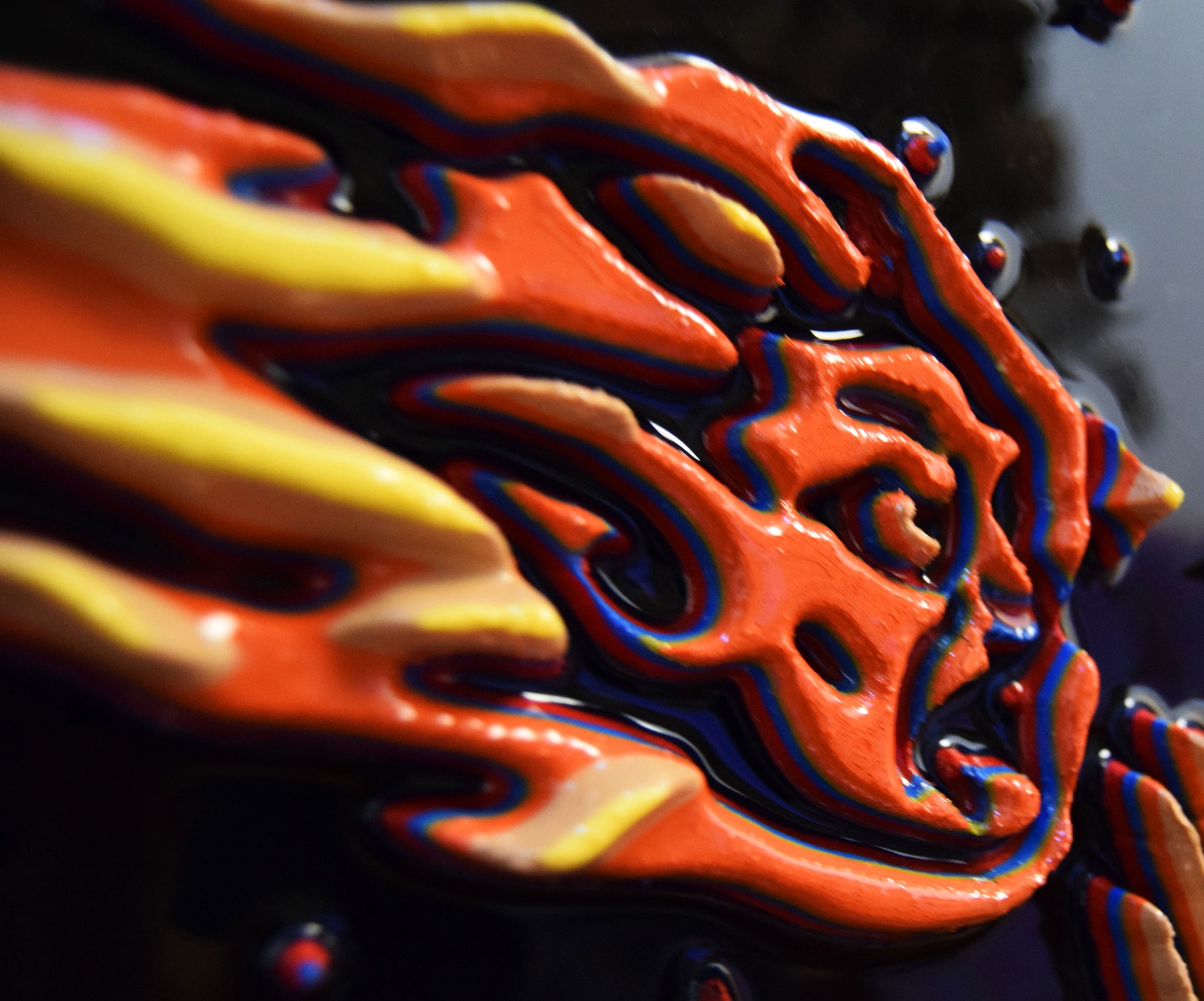 The surface reveals both the energy of the image and the tactile language of 3D printing—ridges, grooves, and striations that expose the machine’s hand in creation, later shaped and unified by the artist. Up close, vivid layers resemble geological strata; from afar, the scene resolves with striking clarity.