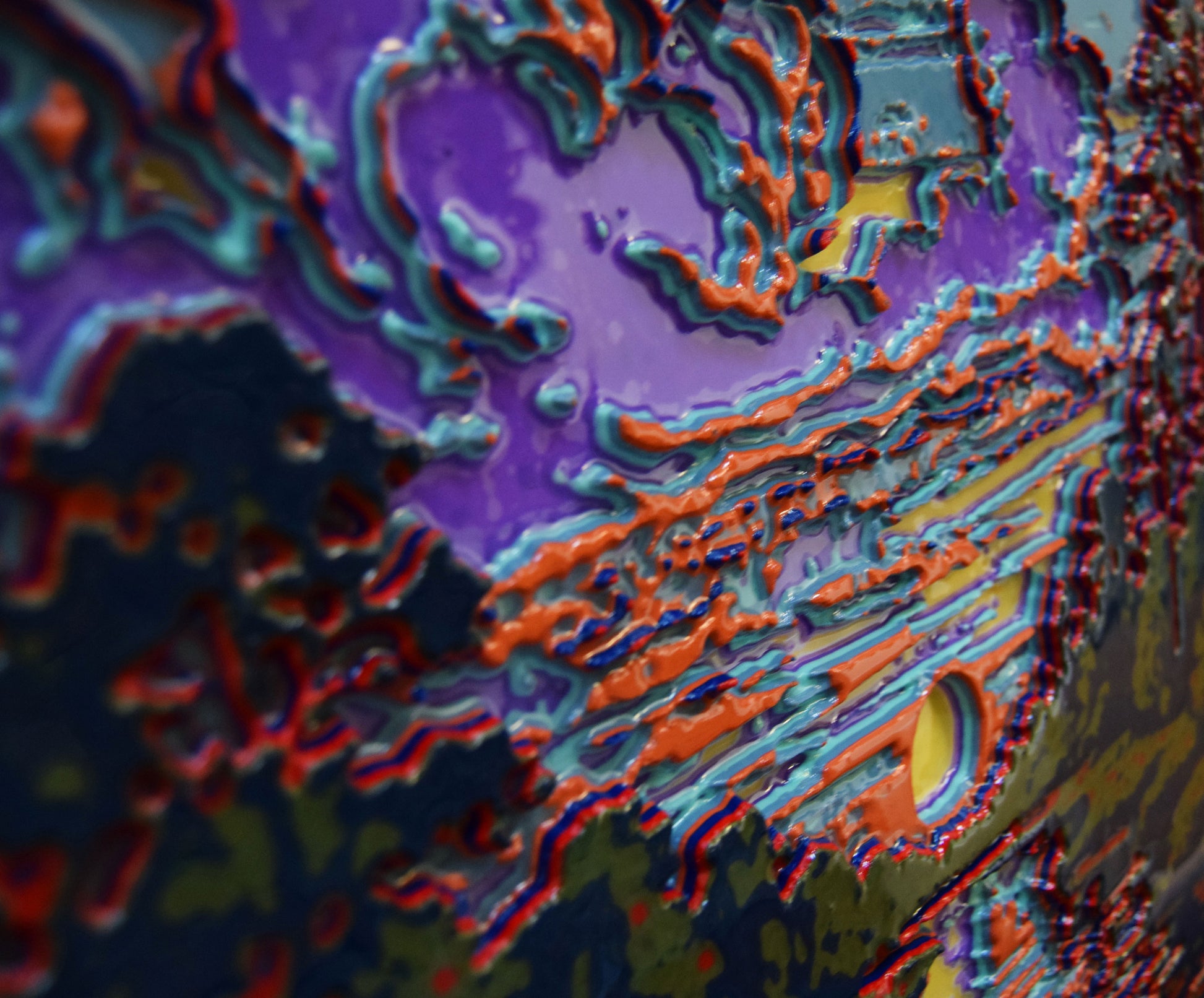 The surface reveals both the energy of the image and the tactile language of 3D printing—ridges, grooves, and striations that expose the machine’s hand in creation, later shaped and unified by the artist. Up close, vivid layers resemble geological strata; from afar, the scene resolves with striking clarity.