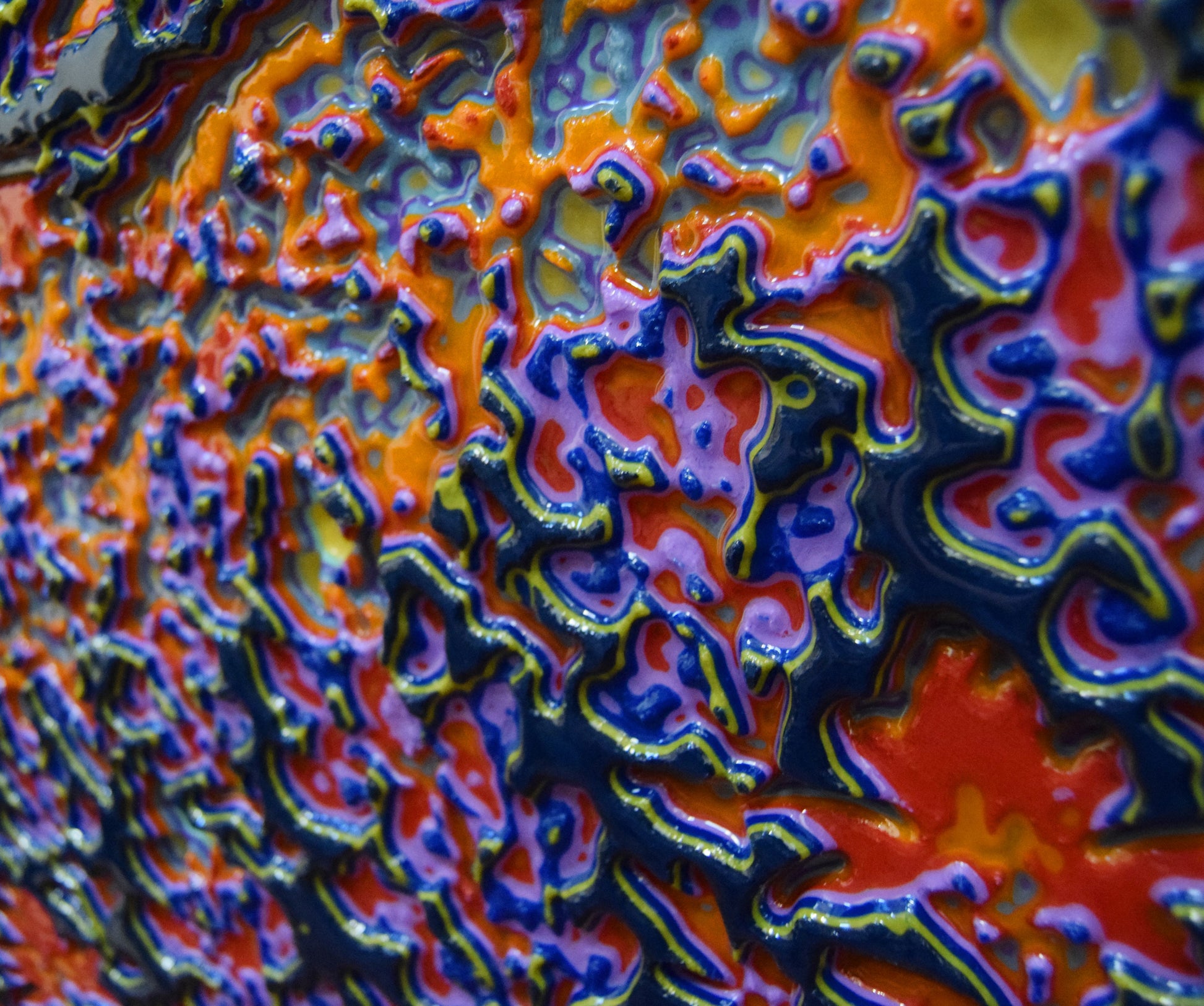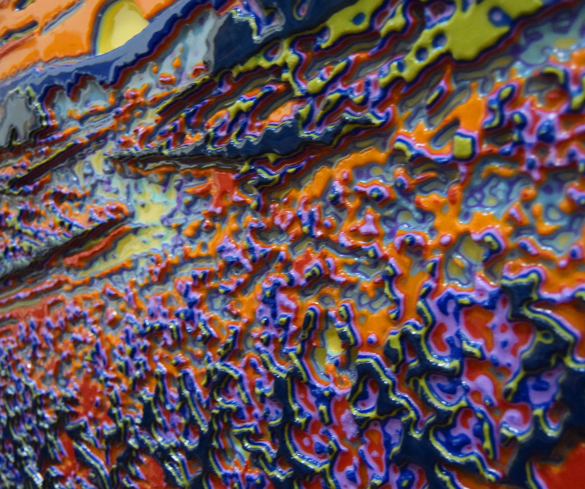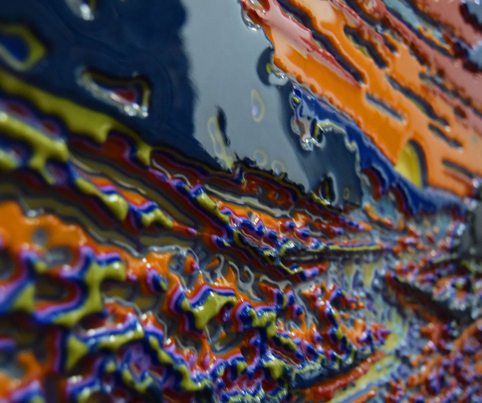 The surface reveals both the energy of the image and the tactile language of 3D printing—ridges, grooves, and striations that expose the machine’s hand in creation, later shaped and unified by the artist. Up close, vivid layers resemble geological strata; from afar, the scene resolves with striking clarity.